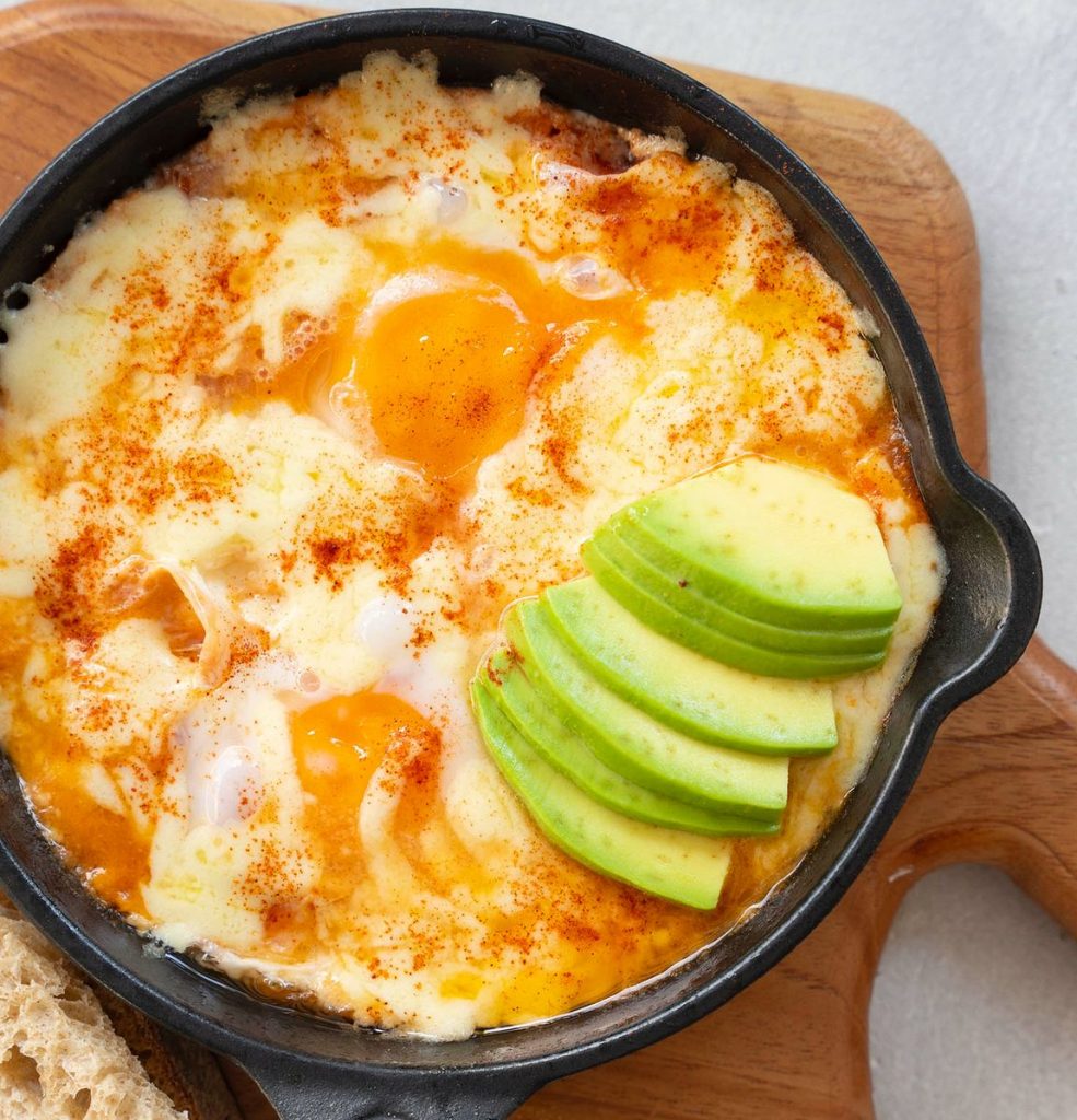 Huevos en una base de pasta de tomate y albahaca, tocineta o jamón y queso mozzarella acompañado de pan y aguacate.