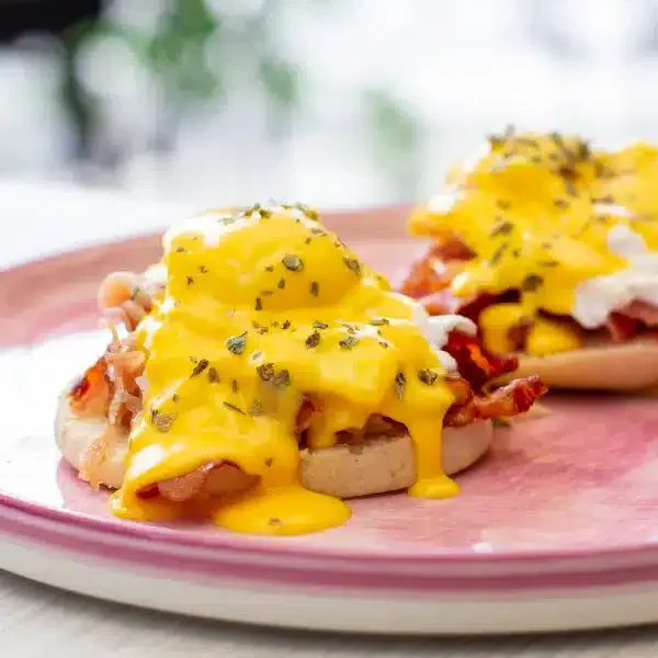 Huevos pochados sobre tocineta, jamón, aguacate o hummus en pan inglés bañados en salsa holandesa