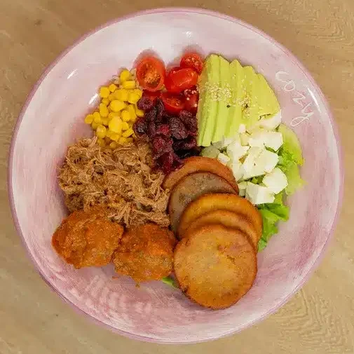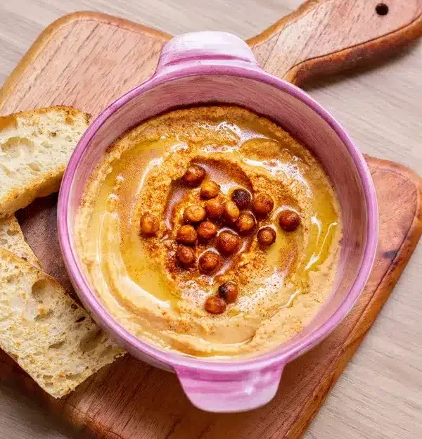 Sanduche en pan focaccia o pan masa madre con hummus, lechuga, aguacate, cebolla encurtida y queso feta, acompañado de papas en paprika o mini ensalada.