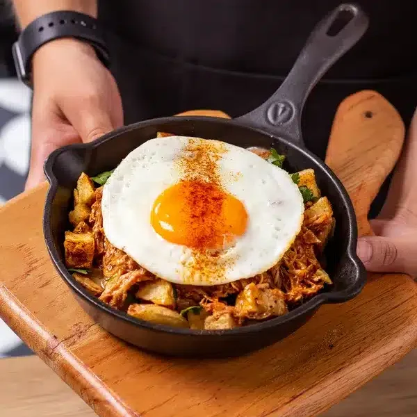 Papas en paprika, salsa de tocineta caramelízala y huevo.