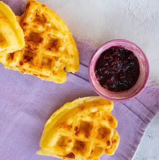 Huevos al gusto, 2 waffles de yuca, aguacate, fruta y mermelada de la casa.